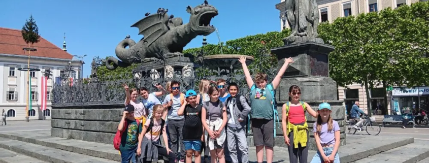 Um 8:20 kam der Zug und um 9:00 waren wir in Klagenfurt. Als Erstes gingen wir die Bahnhofstraße entlang, bis wir am Klagenfurter-Landesmuseum waren. Vor dem Eingang machten wir noch ein paar Bissen von unserer Jause und Frau Ressmann sah sich nach einem Eingang um, den sie wenige Minuten später fand. Plötzlich ging unerwartet die Tür auf und eine Frau stand im Türrahmen und begrüßte uns. Im Inneren erzählte sie uns, wie es früher gewesen war. Als wir um 10:30 aus dem Museum kamen, gingen wir zum Klagenfurter Dom, in den man sogar hinein gehen konnte. Im Inneren war es riesig, doch der Flügelaltar ist viel kleiner als der in der Kirche in Latschach. Nachdem wir fertig waren, las Jaron vor, dass die Kirche wegen Feuer immer wieder aufgebaut werden musste. 100 Meter vom Dom entfernt ist ein Bronze – Relief der Stadt Klagenfurt. Darauf fanden wir den Lindwurm, Maria Theresia und die alte Stadtmauer mit den vier Stadttoren, die in die Nachbarbezirke zeigen. Daraufhin gingen wir weiter und erblickten den Lindwurm und die Statue der Maria Theresia am Neuen Platz. Frau Sticker rief uns zu:“ Setzt euch auf die Stufen, unsere Referat Kinder werden euch jetzt noch einmal alles über den Lindwurm erzählen!“ Danach machten wir noch einige Fotos. Kurze Zeit später gelangten wir auf den Alten Platz, wo wir uns ein Eis kauften. Nach dem Eis waren wir alle wieder gestärkt und es konnte weiter gehen. Als nächstes sahen wir die goldene Gans, die schon einmal gestohlen worden war. Endlich erblickten wir das Landhaus, in dem der Wappensaal mit den 665 Wappen ist. Wir bestaunten die Wappen und den Fürstenstein, zu dem Frau Ressmann auch eine Sage gefunden hatte. Als wir wieder draußen waren, liefen wir schnell weiter. Nun kamen wir zum Wörthersee – Mandl, wo wir ebenfalls ein Foto machten. Als wir den Weg wieder zurück gingen, sahen wir noch den Steinernen Fischer, das Katzen-Kaffee und die Bücherei Haček. Als wir dann beim Bahnhof ankamen, hatten wir noch 30 Minuten Zeit und durften uns in der Bäckerei etwas kaufen. Als wir im Zug saßen, trafen wir drei bekannte Personen. Als wir um 13:30 am Bahnhof in Föderlach ankamen, waren alle mit dem Ausflug zufrieden.