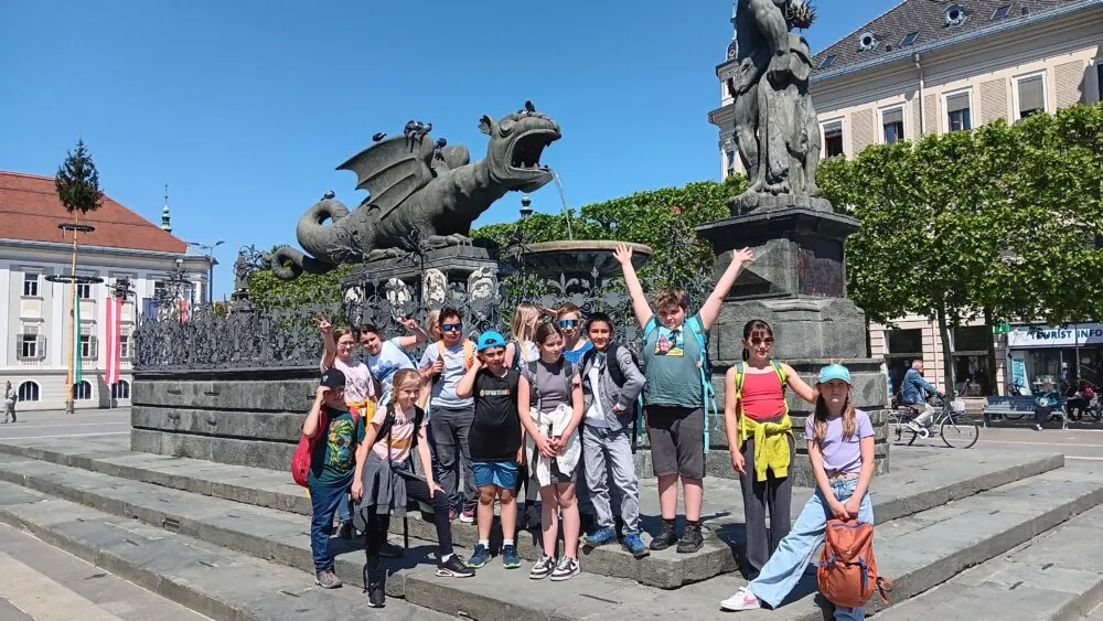 Um 8:20 kam der Zug und um 9:00 waren wir in Klagenfurt. Als Erstes gingen wir die Bahnhofstraße entlang, bis wir am Klagenfurter-Landesmuseum waren. Vor dem Eingang machten wir noch ein paar Bissen von unserer Jause und Frau Ressmann sah sich nach einem Eingang um, den sie wenige Minuten später fand. Plötzlich ging unerwartet die Tür auf und eine Frau stand im Türrahmen und begrüßte uns. Im Inneren erzählte sie uns, wie es früher gewesen war. Als wir um 10:30 aus dem Museum kamen, gingen wir zum Klagenfurter Dom, in den man sogar hinein gehen konnte. Im Inneren war es riesig, doch der Flügelaltar ist viel kleiner als der in der Kirche in Latschach. Nachdem wir fertig waren, las Jaron vor, dass die Kirche wegen Feuer immer wieder aufgebaut werden musste. 100 Meter vom Dom entfernt ist ein Bronze – Relief der Stadt Klagenfurt. Darauf fanden wir den Lindwurm, Maria Theresia und die alte Stadtmauer mit den vier Stadttoren, die in die Nachbarbezirke zeigen. Daraufhin gingen wir weiter und erblickten den Lindwurm und die Statue der Maria Theresia am Neuen Platz. Frau Sticker rief uns zu:“ Setzt euch auf die Stufen, unsere Referat Kinder werden euch jetzt noch einmal alles über den Lindwurm erzählen!“ Danach machten wir noch einige Fotos. Kurze Zeit später gelangten wir auf den Alten Platz, wo wir uns ein Eis kauften. Nach dem Eis waren wir alle wieder gestärkt und es konnte weiter gehen. Als nächstes sahen wir die goldene Gans, die schon einmal gestohlen worden war. Endlich erblickten wir das Landhaus, in dem der Wappensaal mit den 665 Wappen ist. Wir bestaunten die Wappen und den Fürstenstein, zu dem Frau Ressmann auch eine Sage gefunden hatte. Als wir wieder draußen waren, liefen wir schnell weiter. Nun kamen wir zum Wörthersee – Mandl, wo wir ebenfalls ein Foto machten. Als wir den Weg wieder zurück gingen, sahen wir noch den Steinernen Fischer, das Katzen-Kaffee und die Bücherei Haček. Als wir dann beim Bahnhof ankamen, hatten wir noch 30 Minuten Zeit und durften uns in der Bäckerei etwas kaufen. Als wir im Zug saßen, trafen wir drei bekannte Personen. Als wir um 13:30 am Bahnhof in Föderlach ankamen, waren alle mit dem Ausflug zufrieden.